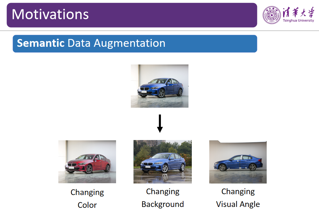 为了进一步提升数据扩增的效果,我们试图进行更加高级的变换。例如,我们把可以更换汽车的颜色、切换一个观测视角、或者换一个车标,此时它仍然是一辆汽车。然而,相较于前文提到的旋转、翻转、裁剪等简单变换,这类相对「高级」的变换要困难得多,我们将其称为「语义数据增强」。在这里,我们将重点讨论如何实现更好的语义数据增强。