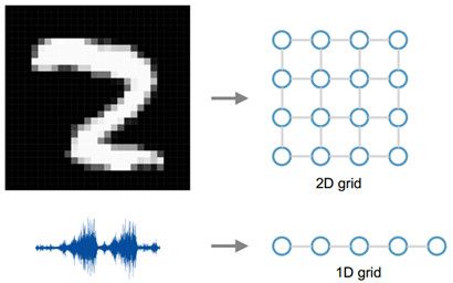 图1:图像、语音的空间数据,节点的连接是规则的,能够用一维、二维的矩阵表示,卷积神经网络处理起来很高效