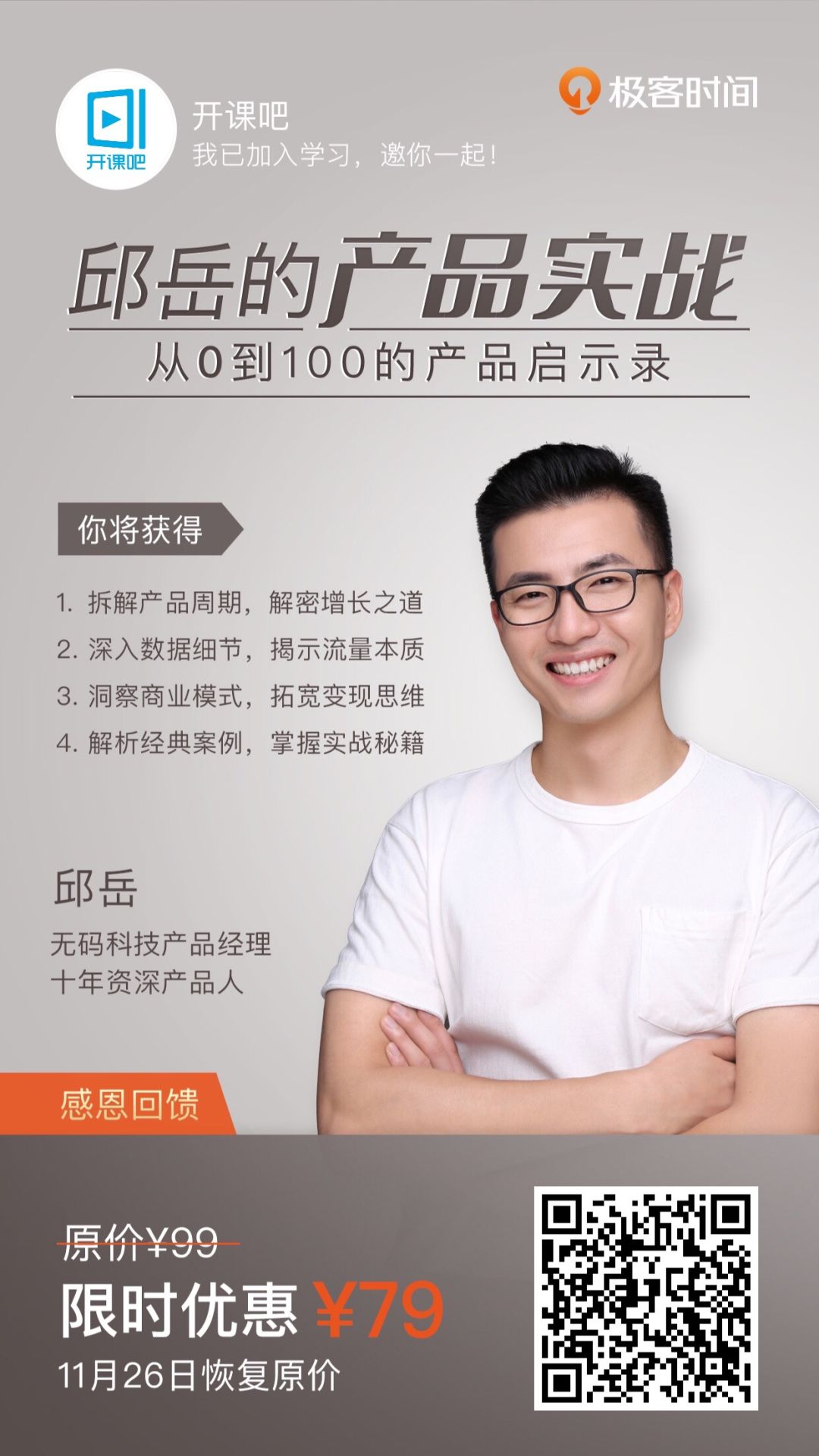 《邱岳的产品实战》,原价99,限时特惠79元。11月26日恢复原价。在此基础上,产品壹佰又另外为大家申请了价值199元的大礼包。