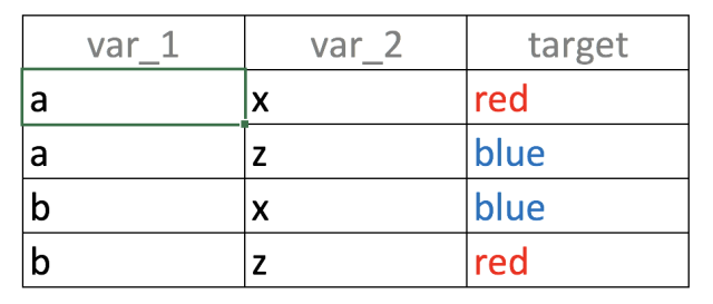 回到这个例子,同时拿两个变量,输入和输出之间一一对应:”如果var_1='a'而且var_2='x'那么target='red'是100%”。您也可以尝试其他组合。