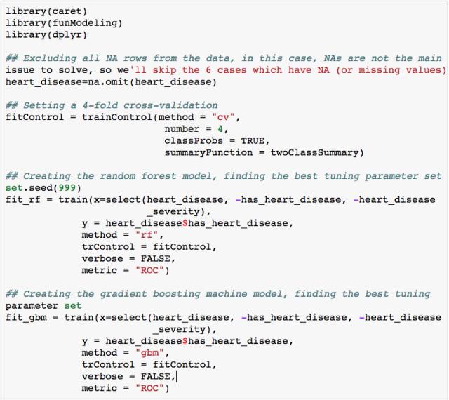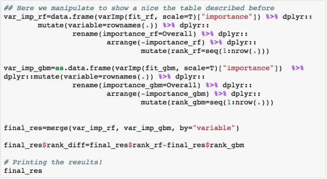 我们将创建两个模型:随机森林和梯度提升机(GBM),使用R包caret来对数据进行交叉验证。如下,我们将比较每个模型返回的最佳变量排名。