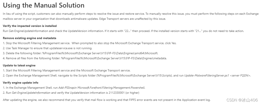 代替使用脚本,客户也可以手动执行步骤来解决问题并恢复服务。要手动解决这个问题,用户必须在组织中每个下载反恶意软件更新的Exchange邮箱服务器上执行以下步骤。