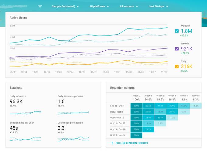 这些数据可从分析仪表界面上看到。开发人员可以跟踪活跃用户、会话和用户留存等特定指标。这些见解给出了机器人健康程度的总体情况,并能预见一般趋势。