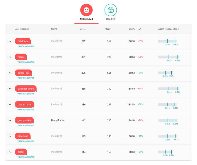 通常情况下,开发人员不得不通过日志文件来查找用户消息中的模式,然而,Chatbase 的系统可以对未被处理的用户消息进行聚类(这仍然只对参加早期测试人员可用),并找到机会来回答更多的请求,并提供了针对这两个问题优化机器人的方法。