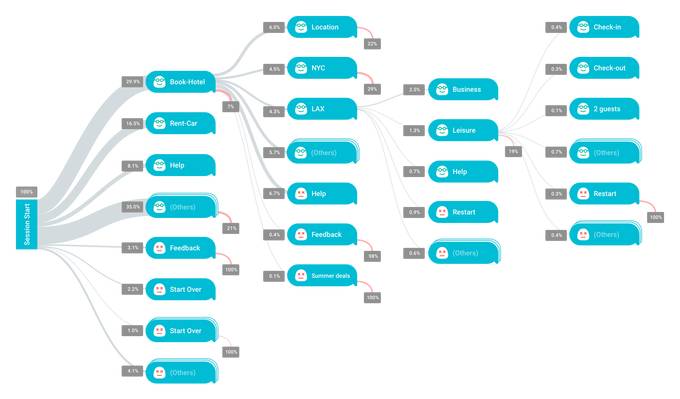 Chatbase 另一个值得注意的功能是,从会话流自动生成数据可视化。这让僵尸程序开发者可以看到,用户使用哪些常用路径,以及他们经常退出应用程序的位置,过滤性报告将突出显示这些步骤,并显示每步的成功率。