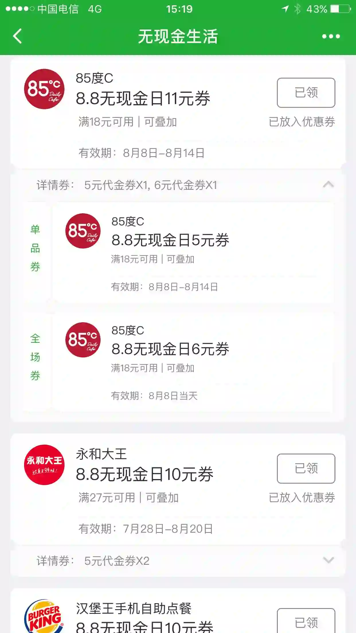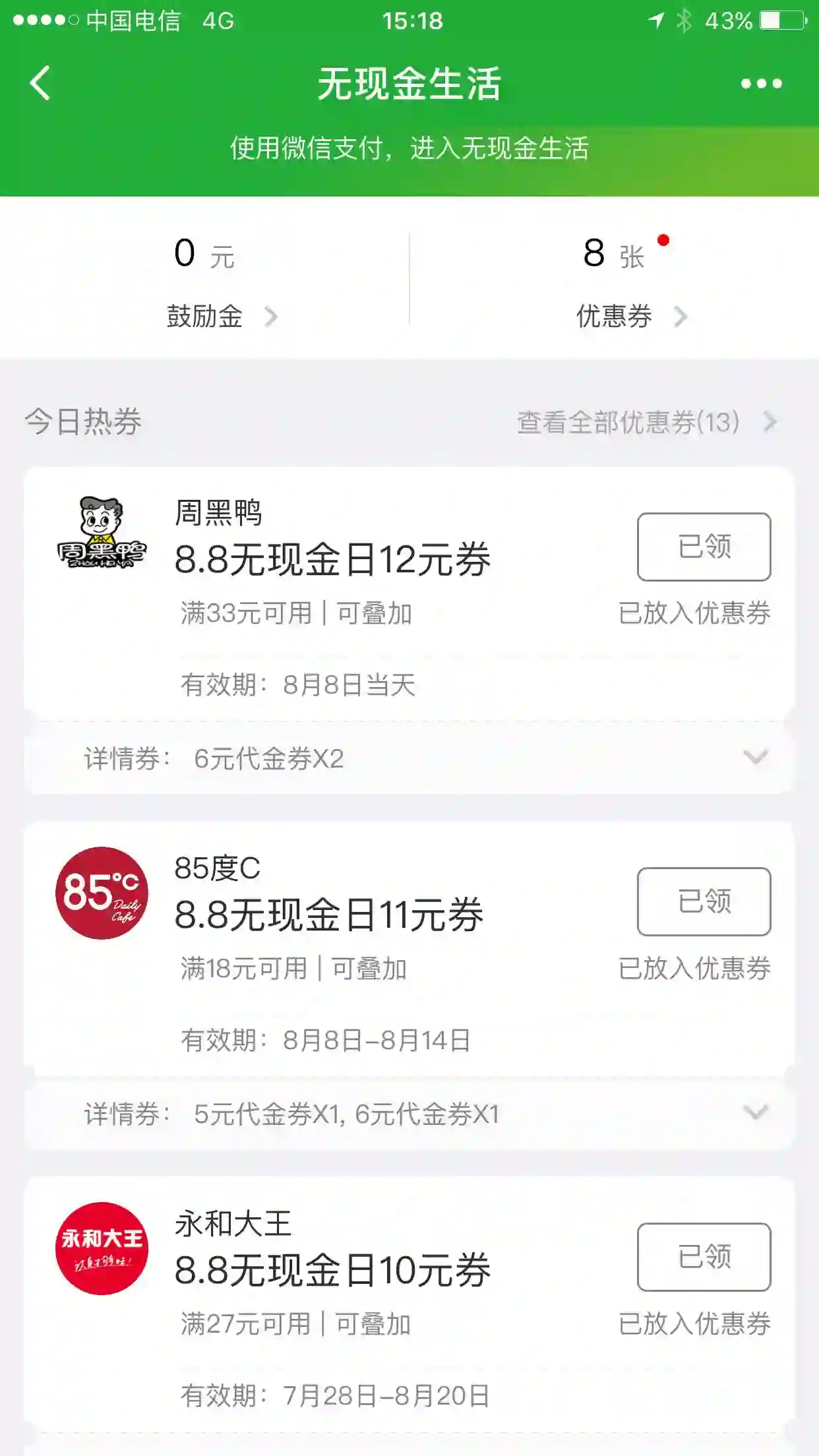 今天,挨踢妹打开公众号“微信支付” - “我的交易”,已经看到了“无现金生活“的周边参与活动的商家的8.8 活动优惠券了……这些券可直接领取,但得等到8月8日使用。