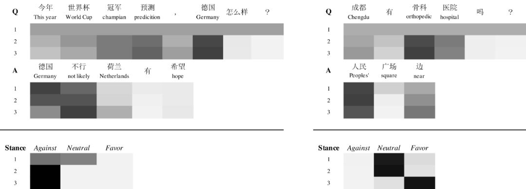 另外通过对Attention权重的可视化,我们可以看到不同模型在提取问题句和回答句语义的差别。这个例子中,只有RCA模型在判断立场类别时,能同时给问题句和回答句词合适的权重。