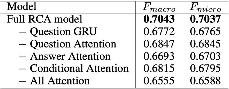 为了分析RCA模型各部分结构对于模型性能的影响,我们做了结构抹除测试。从表格中我们可以看出,问题句的表示对于模型性能影响很大;使用问题句信息从回答句中寻找重要的语义信息比用回答句从问题句提取信息来得更重要。