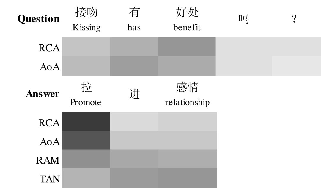 图3 四个模型的注意力权重的可视化图。注意,只有RCA和AoA会在问题上产生注意力,而且我们只会在RAM和RCA模型的最后读取步骤中表示注意力。更深的颜色意味着更大的概率。