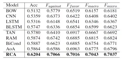我们人工收集标注了一个13000多条的社区问答立场倾向性数据集。在该数据集上,我们将RCA与多个性能优异的现有立场分析模型进行对比。相比四个强基线模型,我们的RCA模型在macro-f1值平均提高2.90%,在micro-f1值上平均提高2.66%,在Accuracy指标上也显著优于所有基线模型,证明了我们的模型循环阅读和交错更新结构的有效性。