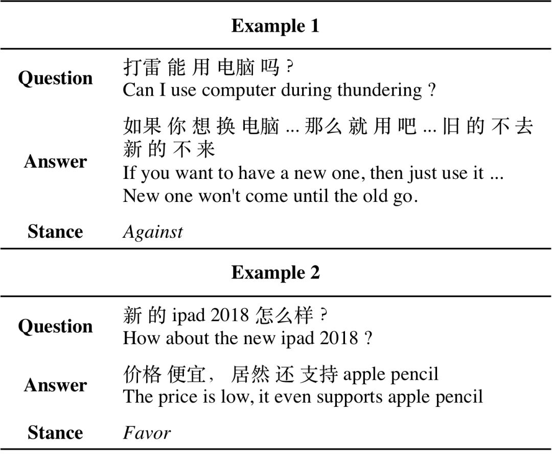 ,AnswerStance任务旨在判别回答句对于问题句的立场标签。例如,在图1的第2个例子中,回答句通过肯定“iPad 2018的定价”来表达favor立场。