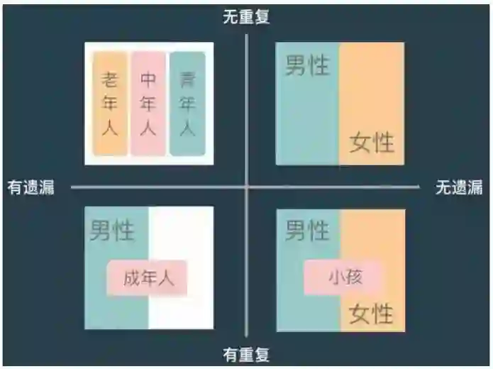 在按照 MECE 原则将某个整体(不论是客观存在的还是概念性的整体)划分为不同的部分时,必须保证划分后的各部分符合以下要求: