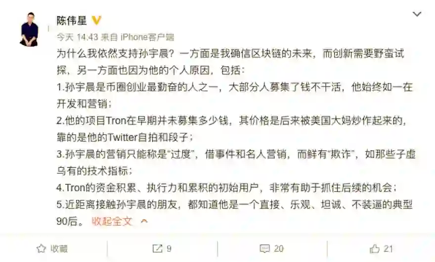 今日,波场创始人孙宇晨终于盼来了友军的支援。泛城资本、快的打车创始人陈伟星在微博上力挺孙宇晨。陈伟星表示:一方面是我确信区块链的未来,而创新需要野蛮试探,另一方面也因为“孙宇晨是币圈创业最勤奋的人之一,大部分人募集了钱不干活,他始终如一在开发和营销”、“孙宇晨的营销只能称是“过度”,借事件和名人营销,而鲜有“欺诈”,如那些子虚乌有的技术指标。”