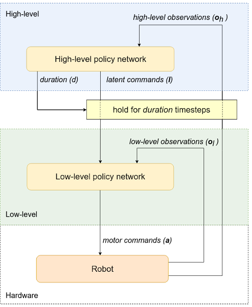 分层策略的框架:此策略从机器人获得观察结果,并发送电机命令以执行期望的动作。此框架分为两个级别(高和低)。高级策略会向低级策略发出潜在命令,同时确定低级策略的运行持续时间