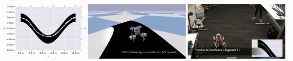 机器人在曲线路径上成功走完的轨迹。左图:机器人走过的轨迹图,轨迹上的点标记高级策略向低级策略发送新的潜在命令的位置;中图:机器人在模拟环境中沿路径行走;右图:机器人在实际环境中绕路径行走