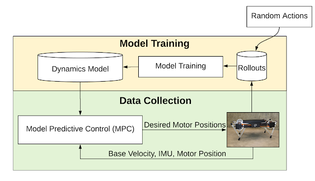 我们首先在机器人上执行随机动作,然后将模型拟合到所收集的数据。拟合模型后,我们通过模型预测控制 (Model Predictive Control,MPC) 规划器来控制机器人。我们在通过 MPC 收集更多数据与重新训练模型以更好地拟合环境动力学这两个过程之间进行迭代。
