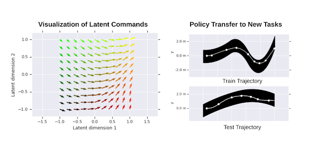 左图:习得的二维潜在命令空间的可视化:矢量方向对应于机器人的移动方向。矢量长度与走过的距离成正比。右图:低级策略的迁移:HRL 策略是在单一路径上训练的(右上)。在其他路径(右下)上训练高级策略时,将重复使用习得的低级策略