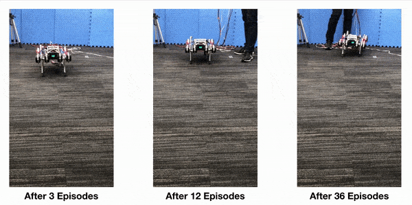 在《腿足式机器人的数据效率强化学习》(Data Efficient Reinforcement Learning for Legged Robots) 中,我们展示了一种高效学习低级运动控制策略的方法。通过将动力学模型拟合到机器人并实时规划动作,机器人可以利用不到 5 分钟的数据来学习多项运动技能。