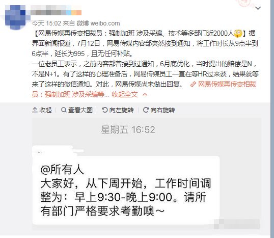 据《界面》报道,网易传媒疑似启动新一轮变相裁员,公司内部通知要实行995工作制。同时,一位在网易传媒工作了近四年的老员工表示,之前内容部曾经接到过通知,6月底整体部门要进行优化,当时因为给出了一定的准备时间,所以提出的赔偿是N,不是N+1。有了这样的心理准备后,网易传媒员工一直在等HR过来谈,结果就等来了这样的微信通知。