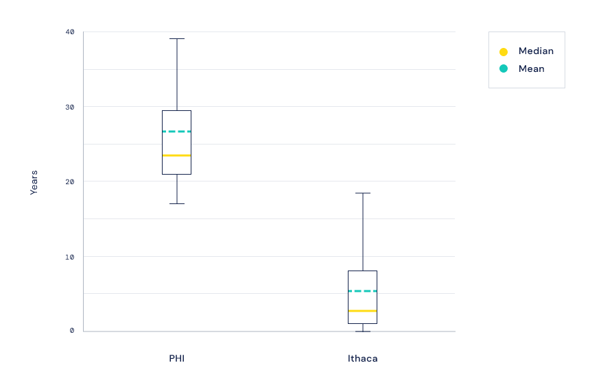 「伊萨卡」AI对处理的古希腊铭文的年代估测值、帕卡德人文学院的旧有铭文年代估计值、与历史学界最新的铭文年代精确估计值对比