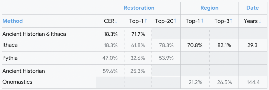 在单独恢复受损文本方面,「伊萨卡」的字符错误率为26.3%、比单独人工预测的结果好2.2倍,最确定预测结果的准确率达到了61.8%。
