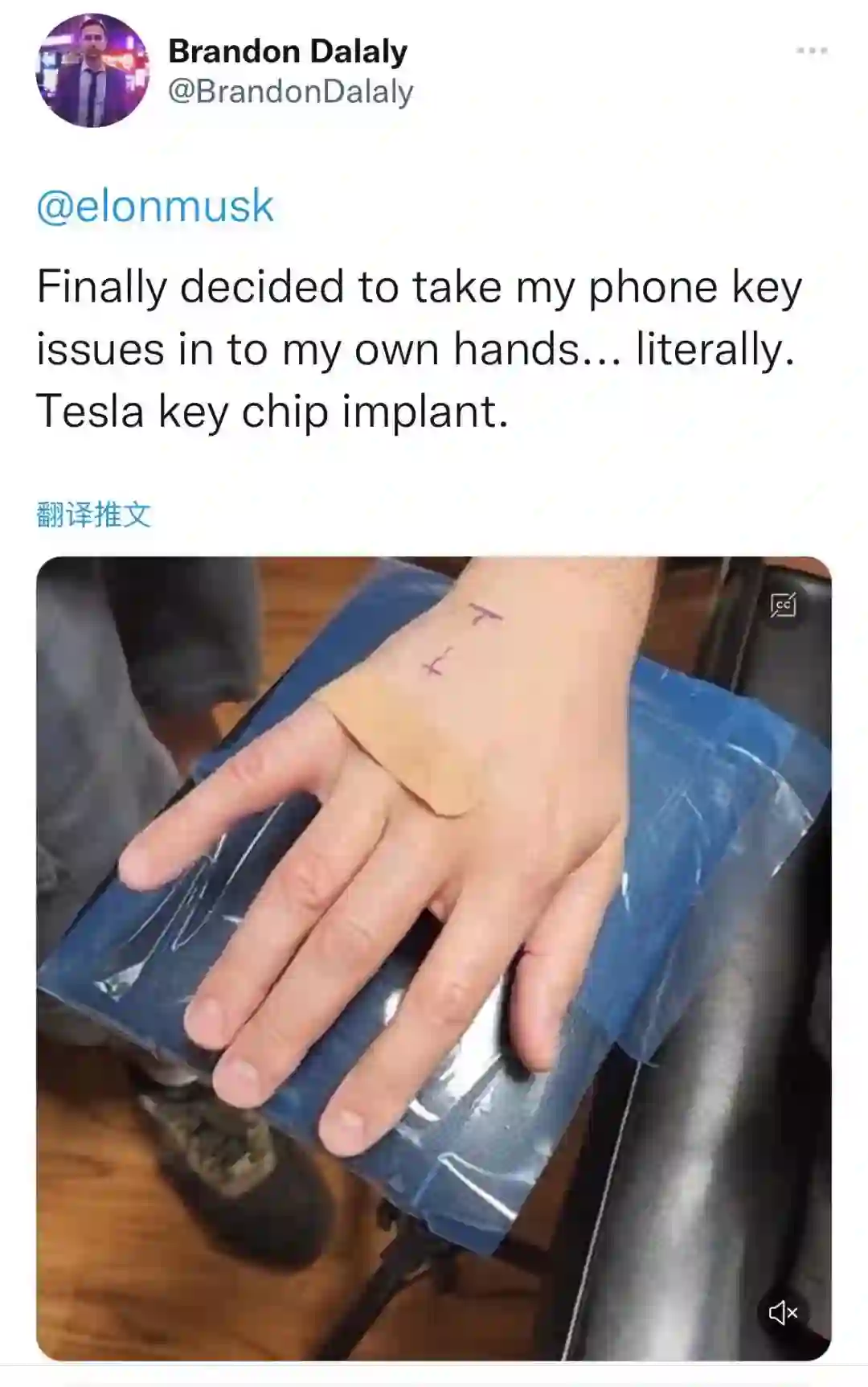 甚至,Brandon Dalaly 还 @ 了马斯克的推特:“最后,我决定把手机钥匙的问题放到我自己手上…字面意义上的,植入特斯拉钥匙芯片。”