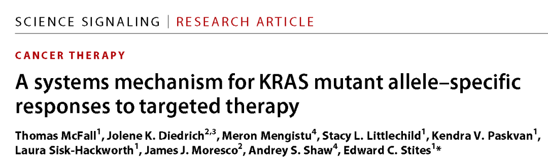 Thomas McFallA, et al. Systems mechanism for KRAS mutant allele–specific responses to targeted therapy. Science Signaling, 24 Sep 2019: Vol. 12, Issue 600, eaaw8288