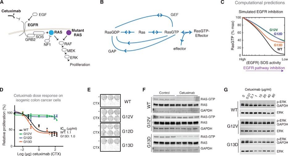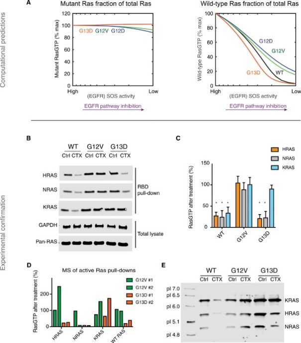这一发现证明,与NF1相互作用强且竞争性抑制NF1的KRAS突变体,能以与EGFR无关的方式驱动野生型RAS活化,而KRAS G13D与NF1蛋白相互作用弱且不能竞争性抑制NF1,因此KRAS G13D突变后的细胞使野生型RAS活化的同时,仍然可以依赖EGFR发挥作用。