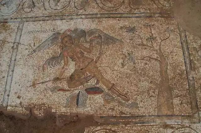 大地砖保存了两副图案,各讲述了一个三俗段子。古罗马人没有拿自己的主神开涮,段子的梗来自古希腊神话的两位漂亮少年,伽倪墨得斯(Ganymede)和纳瑟斯(Narcissus)。