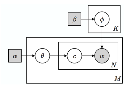 在这样的定义下,原始的矩阵C仍然可以表述为C=U∑VT。这样的对应关系让我们更加清晰地看到了前面提到的pLSA在概率方面的良好定义和清晰含义,同时也揭示了隐语义概率模型和矩阵分解之间的密切关系(关于概率模型和矩阵分解的密切关系可参考这篇文档:http://www.cs.cmu.edu/~epxing/Class/10708-15/slides/LDA_SC.pdf)。在这样的定义,隐变量z所代表的主题含义更加明显,也就是说,我们可以明确的把一个z看作一个主题,主题里的词和文档中的主题都有着明确的概率含义。也正是由于这样良好的性质,再加上优化方法的便捷性,使得从pLSA开始,文本主题开始在各种大数据应用中占据重要地位。