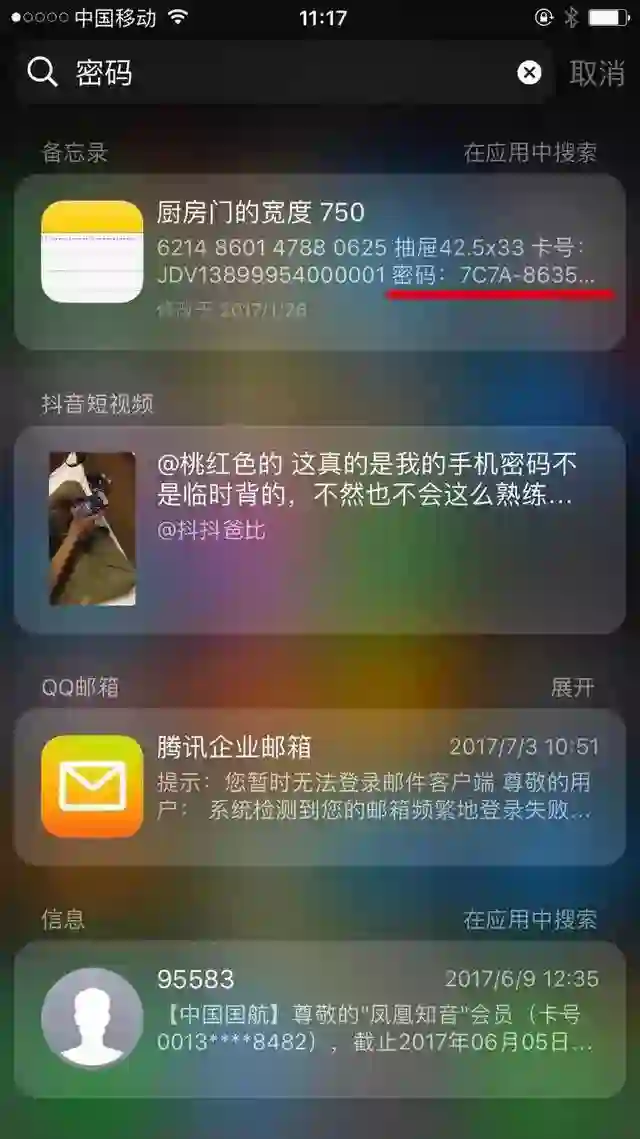 但这样风险也就随之而来,如果你的iPhone被别有用心的人拿到,很有可能会被直接搜索到你在某些APP记录下来的用户名密码,和别人说过的一些私密事件,甚至你在微博或是百度里面曾经搜索过的人名(比如前女友/前男友),都能被Spotlight搜索查出来,仔细想想是不是非常可怕?!