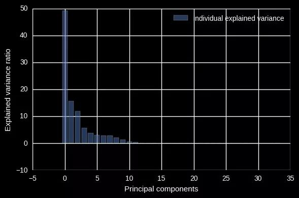 (3)特征降维。收集到的数据有可能会有非常多的特征,在机器学习中过多特征不一定能提高识别准确率,反而可能造成过拟合现象,并严重拖慢执行效率。主成分分析法(PCA)是一种常用的降维方法,它能根据特征间的相关性,选择出对识别最有用的特征。下图为PCA降维的效果图,可以看出前七个特征可以基本反映全部的信息量,而后面的特征包含的信息量很少,可以去除。