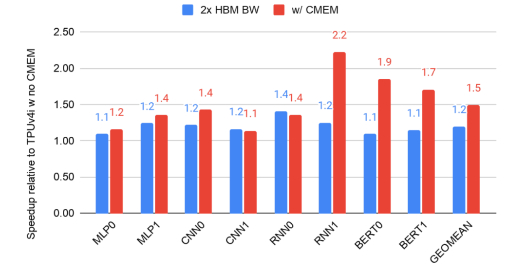 为了理解 CMEM 对生产应用的影响,下图比较了启用 CMEM 的双倍 HBM 带宽与启用 CMEM 的标准 HBM 带宽的性能。通过编译标志来禁用 CMEM,同时在 TPUv4 运行时禁用一个内核,使得一个内核的 HBM 带宽增加了一倍。