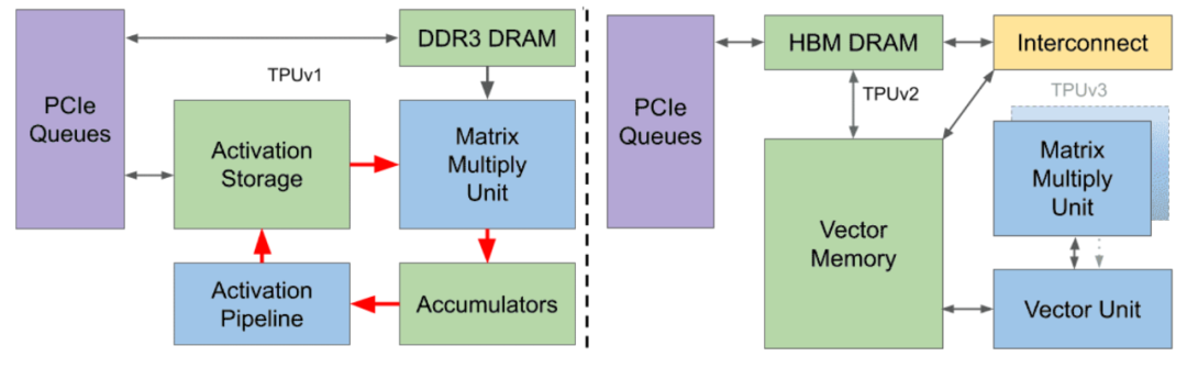 图 1:从 2015 年开始部署在谷歌数据中心的 3 个 TPU 的框图。