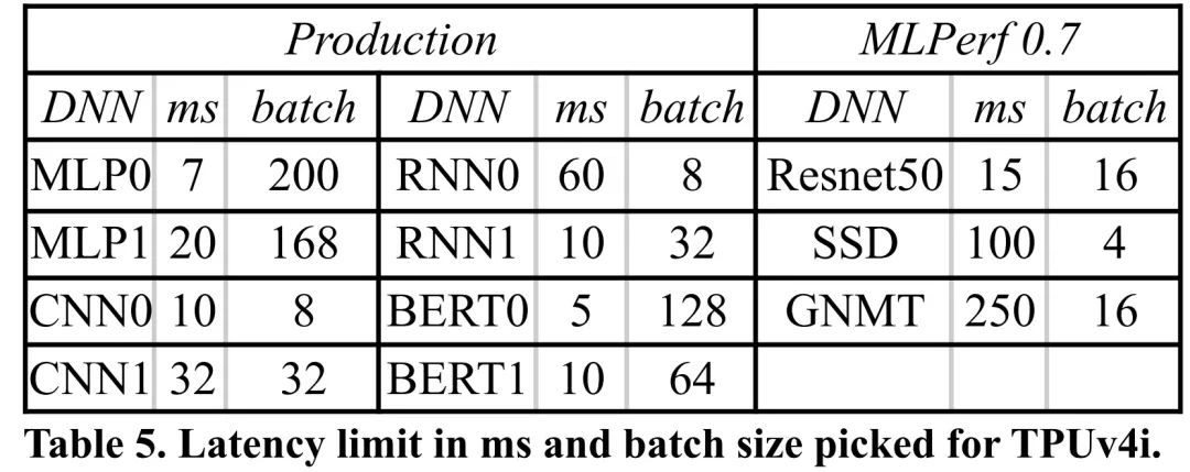 近来 DSA 的论文根据批大小重新定义了延迟限制,通常设置为 1。表 5 给出了生产应用程序的 P99 时间 SLO 和 MLPerf 推理基准测试,并显示了近来符合 SLO 的 TPU 的最大批。显然,数据中心应用程序限制了延迟,而不是批大小。未来的 DSA 应该利用更大的批大小。