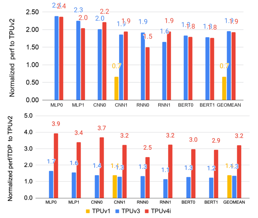 下图比较了TPUv1、TPUv3和TPUv4i在生产推理应用上相对于TPUv2的性能和perf/TDP。TPUv3 和 TPUv4i 都比 TPUv2 快 1.9 倍以上,TPUv1 的速度大概是 TPUv2 的 70% 左右。更大、更热的 TPUv2/v3 芯片有两个内核,而较小的 TPUv4i 芯片有一个内核,这使 TPUv4i 芯片在 perf/TCO 和部署方面更胜一筹。
