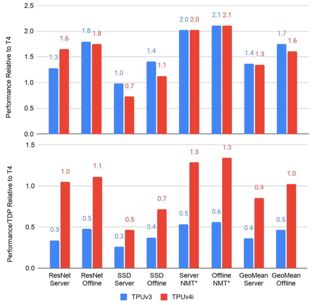 下图使用 MLPerf 推理 0.5-0.7 版本基准测试比较了 TPUv3 和 TPUv4i 相比于 NVIDIA T4 的性能和 perf/(system)TDP。