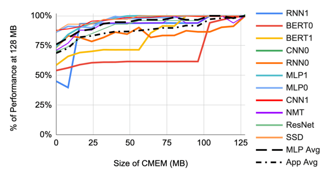 最后,下图展示了小于 128 MB 的 CMEM 对应用程序和 MLPerf 服务基准测试的影响。