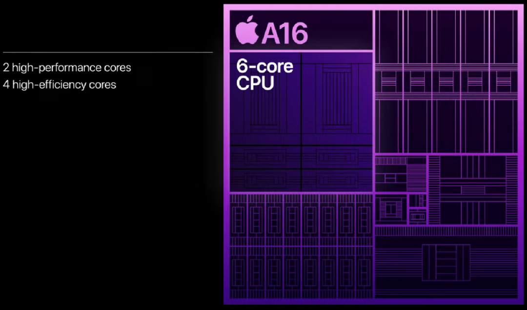 A16 拥有 160 亿晶体管,2 大核 4 小核设计,采用了台积电最先进的 4 纳米制程工艺打造。苹果表示,A16 的大核功耗比上代降低 20%,小核跟业界竞品相比,只需要 1/3 的功耗就能实现同样的速度。