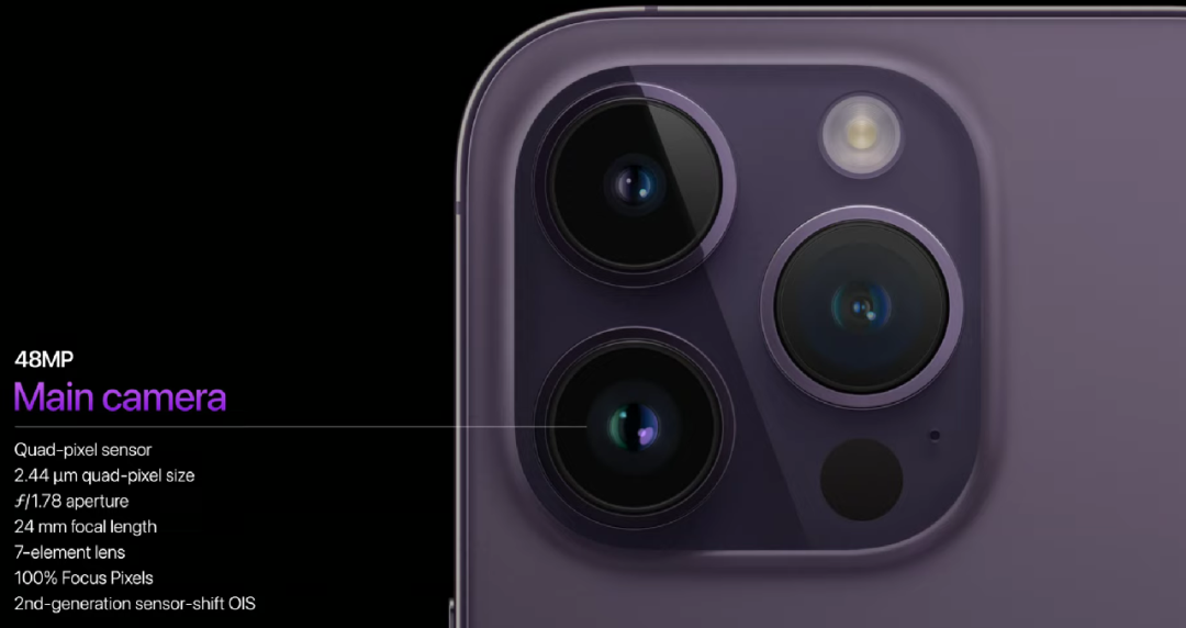 影像方面相较 iPhone 14 系列有了大幅提升。后置采用全焦段三摄设计,主摄升级为 4800 万像素,最高 4 倍分辨率,24 毫米焦距,迄今为止最大的四合一像素传感器(较 13 Pro 大了 65%),2.44 微米四合一像素,ƒ/1.78 光圈,第二代传感器位移式光学防抖等。