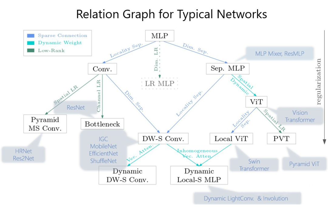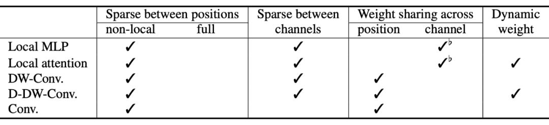 ▲ 不同结构在稀疏连接、权重共享、动态权重上的对比。D-DW-Conv. 表示动态 DW 卷积