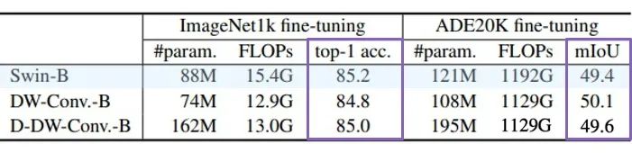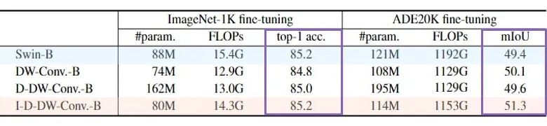 Depth-wise 卷积和 Local Attention 的设计原则如此相似,然而为什么 Local Attention 取得了如此高的表现力,而 Depth-wise 卷积没有呢?为了验证这一问题,文章使用 Depth-wise 卷积替换 Swin Transfomer 中的所有 Local Attention 模块,其他结构保持不变(per-LN 修改为 post-BN),同时为了验证动态 DW 卷积的效果,文章构建了两种 dynamic 特性的 Depth-wise 卷积: 1)D-DW-Conv. 第一种 dynamic DW 卷积,采用和普通 DW 卷积相同的权重共享方式,图像空间共享卷积核,通道间独立卷积核。并使用 Global Average Pooling 处理 input feature,然后通过 FC Layer 来 dynamic 预测出动态卷积核。 2)I-D-DW-Conv. 第二种 dynamic DW 卷积,采用和 Local Attention 相同的权重共享方式,每个像素(token)采用独立的聚合权重,而在 channel head(group)中共享权重。称为 Inhomogeneous Dynamic DW 卷积。 来看一看实验结果如何: