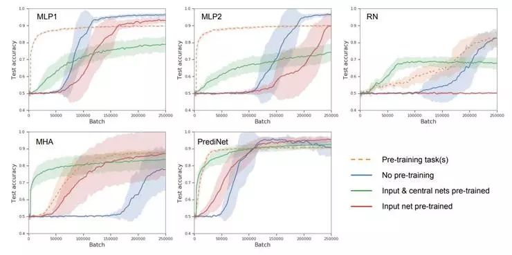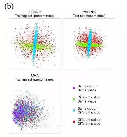 首先,横坐标是训练样本数量,纵坐标是准确率,即模型表现随训练样本增加的变化,那么所有曲线都是越贴近左上角越好,这里已经能看出 PrediNet 的优势。其次,作者们认为尤其值得注意的是第三个阶段的表现,冻结 CNN 层和中央模块,仅更新多层感知机,图中绿线。冻结现有的表征不变,向新的任务适应(迁移),PrediNet 的学习速度是最快的,也是唯一一个在训练结束后得到了 90% 准确率的模型。这就说明了 PrediNet 学习到的表征确实更加多任务通用。