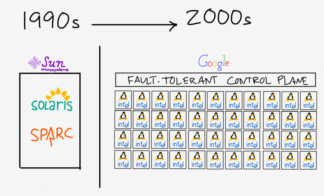 不久前,英特尔还是一个来降维打击的角色。服务器市场最初的主导者是 Sun 微系统公司这样的综合性公司,其产品价格很高,后来 PC 营收的暴涨使得英特尔快速提升性能同时降低价格。当然,PC 的可靠性无法与集成服务器相比。但在本世纪初谷歌就意识到,其所提供服务的规模和复杂度意味着构建真正可靠的堆栈是不可能的事情,解决方案是基于(相对)廉价的英特尔 x86 处理器构建数据中心。