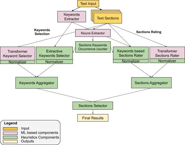 下一个任务是确定哪些部分信息丰富且具有独特性,并将其突出显示。为了完成此任务,我们再次结合使用上述两个模型,评估每个部分的重要性,并生成对应的分数。我们通过获取该部分中所有关键字的 TF-IDF 得分,并根据其在该部分中的出现次数加权,然后计算这些单个关键字得分的总和,计算出第一个分数。我们通过双向 Transformer 模型运行各部分文本,并以此计算第二个分数,该模型也接受了各部分评分任务的训练。标准化并合并两个模型生成的分数,得出各部分的分数。