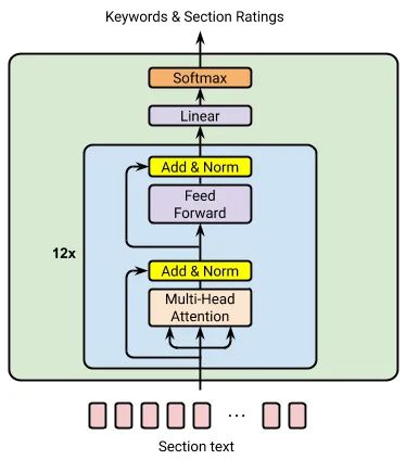 在每项任务中,我们都使用了两种不同的自然语言处理 (NLP) 方法:基于 Wikipedia 数据集中数据进行预训练的精简版双向 BERT 模型,以及经过精简的词频-逆文本频率 (TF-IDF) 模型。我们并行使用双向 Transformer 和基于 TF-IDF 的模型进行关键字提取和重要部分识别任务,同时使用聚类启发式算法,这样既能够利用每种方法的优势,又能避免它们各自的弊端(在下一节讨论)。