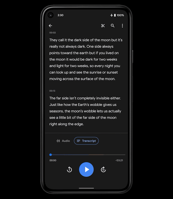 我们去年发布的 Recorder 是一款利用设备端机器学习 (ML) 将录音转录为文本,可突出显示音频事件并为标题标签提供合理建议,让音频录制变得更加智能和实用的全新的录音应用。通过转录功能,它使编辑、共享和搜索变得更加容易。Recorder 支持转录长时间的录音(最高可达 18 个小时!),有时用户很难找到所需的某一特定部分,因此需要一种全新的解决方案来快速浏览这种长度的转录文本。