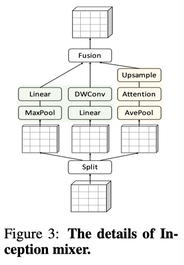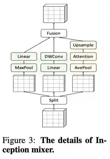 具体而言,作者设计了一个 Inception mixer,以移植卷积和最大池化的优点,将高频信息捕获到 Transformer。与最近的混合框架不同,Inception mixer 通过通道分裂机制带来了更高的效率,采用并行卷积/最大池化路径和自注意路径作为高频和低频混频器,同时能够灵活地建模分散在较宽频率范围内的鉴别信息。