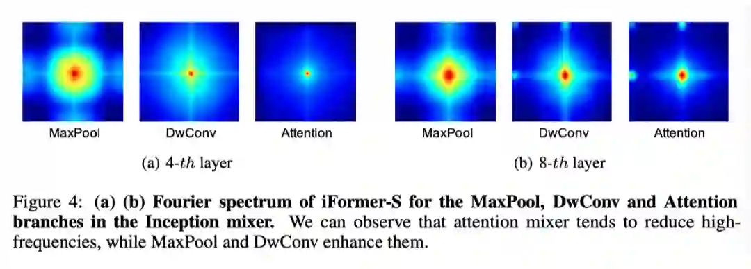 为了进一步探索该方案,上图显示了 Inception mixer.中注意、MaxPool 和 DwConv 分支的傅立叶谱。