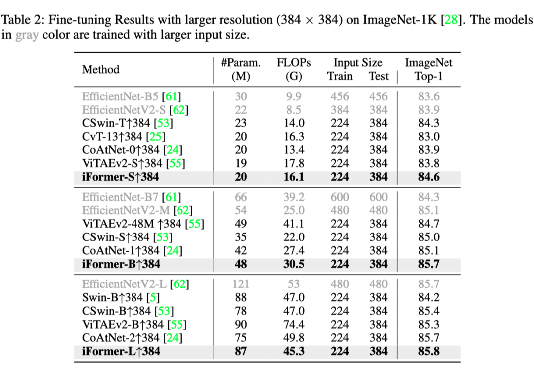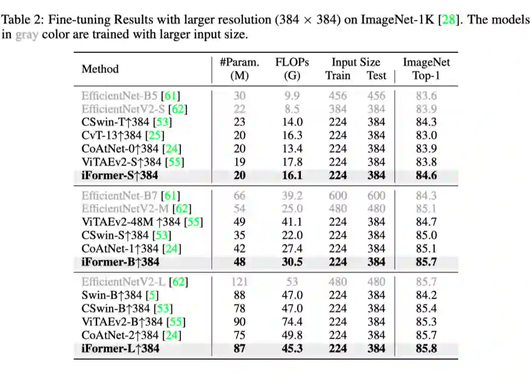 上表报告了较大分辨率(即 384×384)的微调精度。可以观察到,iFormer 在不同计算设置下的表现始终优于同类模型。这些结果清楚地表明了 iFormer 在图像分类方面的优势。